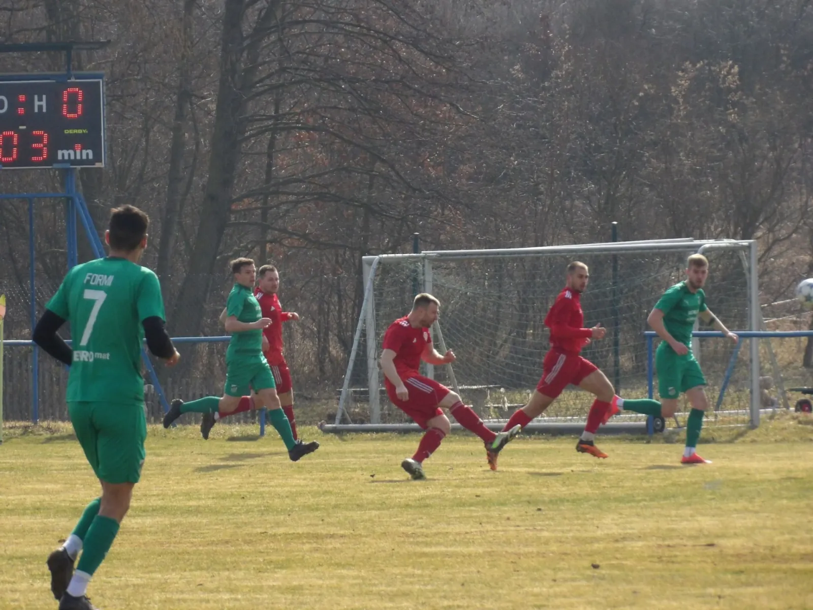 Herně patřil vstup do utkání Neštěmicím, ale složitá kombinace na velmi těžkém terénu nevedla k velkému ohrožení branky Modlan. Domácí vystrkovali růžky pomalu, ale ve 27.minutě se radovali z vedoucí branky. Čermák ještě proti střele z blízkosti zakročil, ale nikým nehlídaný Dolejší už skóre otevřel. Inkasovaná branka hosty evidentně opařila a ve zbytku poločasu se hrál celkově fotbal nevalné úrovně, i proto se na vedení domácího Baníku nic nezměnilo.
