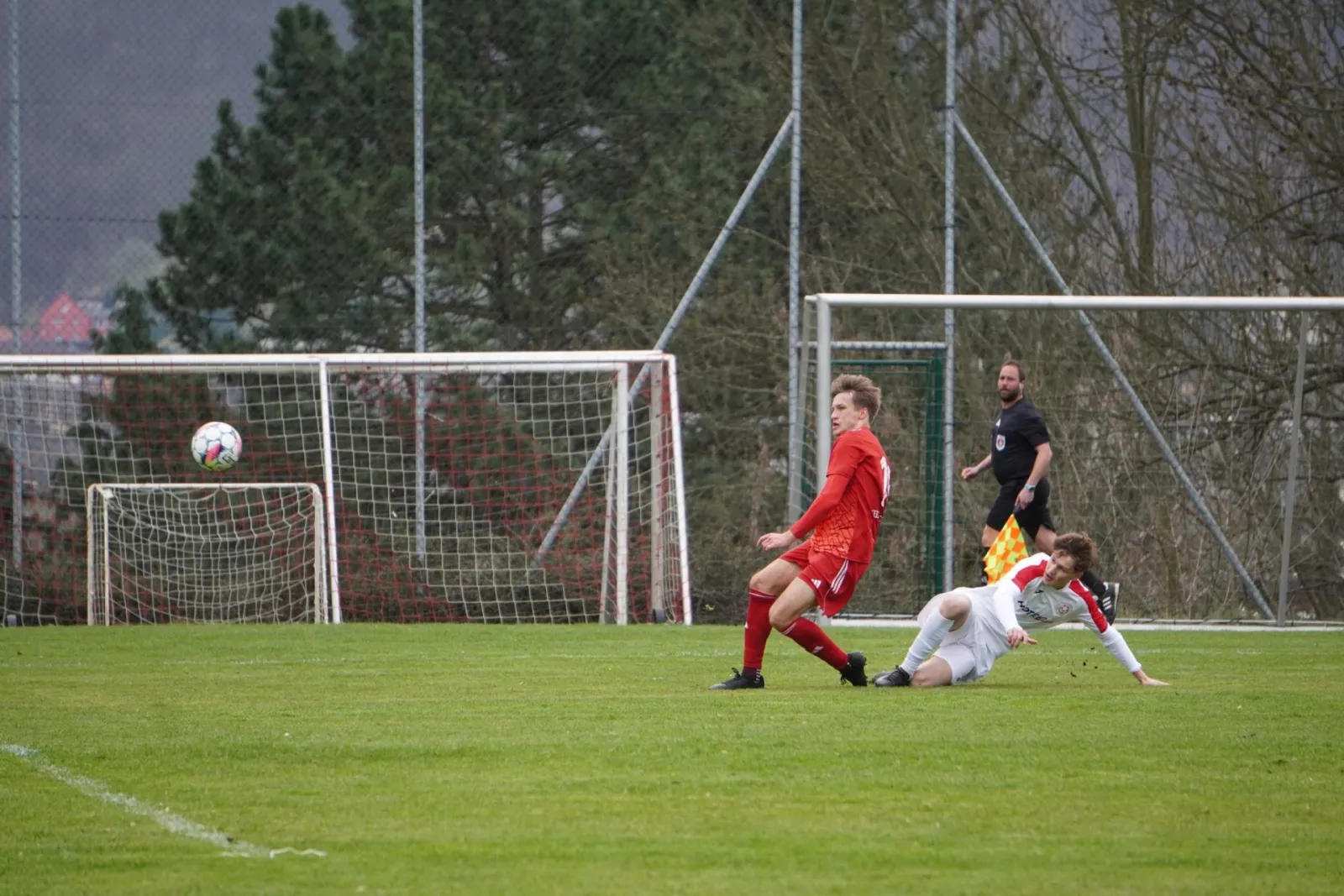 Od úvodních minut se hrálo převážně na polovině Proboštova. Skóre utkání načal již v šesté minutě efektními nůžkami Samer Al-Eraidi. Hosté se prakticky celý poločas nemohli vymanit z tlaku Neštěmic, spoléhali se jen na nákopy, ale ty v prvním poločase k ničemu nevedly. A jelikož domácí hráči pálili jednu šanci za druhou, tak se do kabin odcházelo za těsného vedení domácího celku.