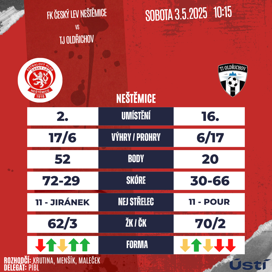 Podzimní mistrovské utkání v Oldřichově ovládli jednoznačně 5:0 hosté. Dvakrát se mezi střelce zapsal Petr Barnat. Po jedné trefě přidali Pavlíček, kapitán Martínek a Tomáš Kotrba. Sobotní šutkání 24.kola má výkop pro Neštěmice v tradiční čas 10:15. Utkání bude řídit jako hlavní rozhodčí Radek Krutina, jeho asistenty budou Menšík a Maleček.